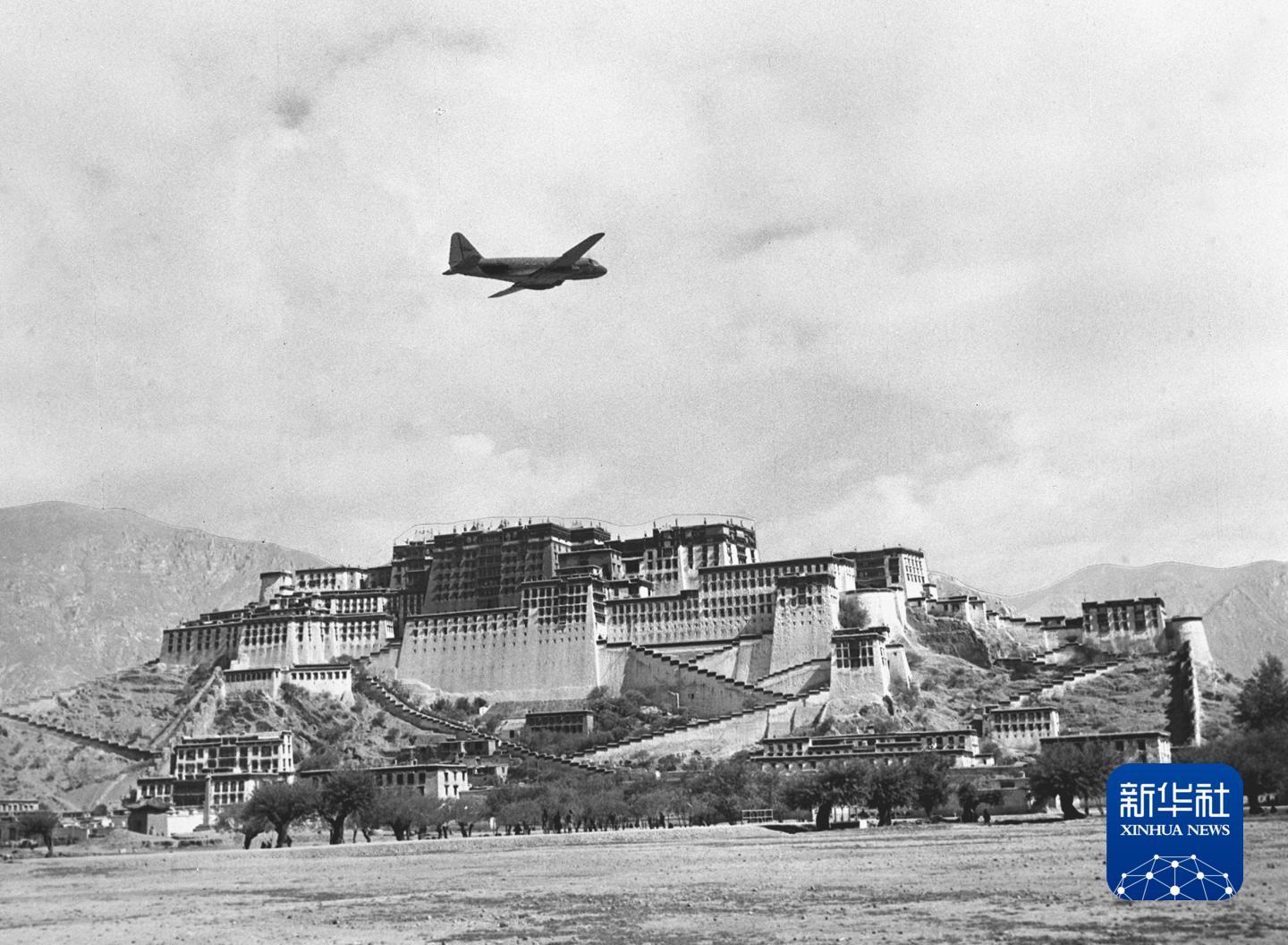 1956年5月26日,北京—拉萨航线正式试航成功。从北京出发的飞机越过重重雪山,飞临拉萨布达拉宫上空。