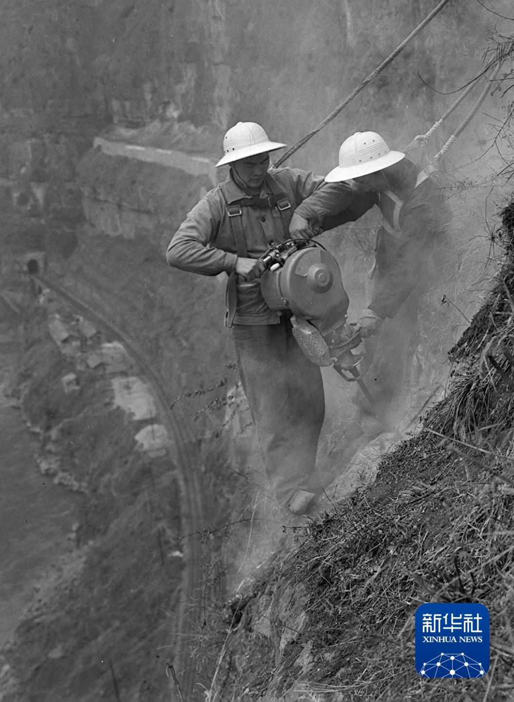 1974年3月,四川西昌铁路分局乌斯河工务段工人排除大渡河两侧悬崖峭壁上的危岩和孤石,保证成昆铁路安全通车。