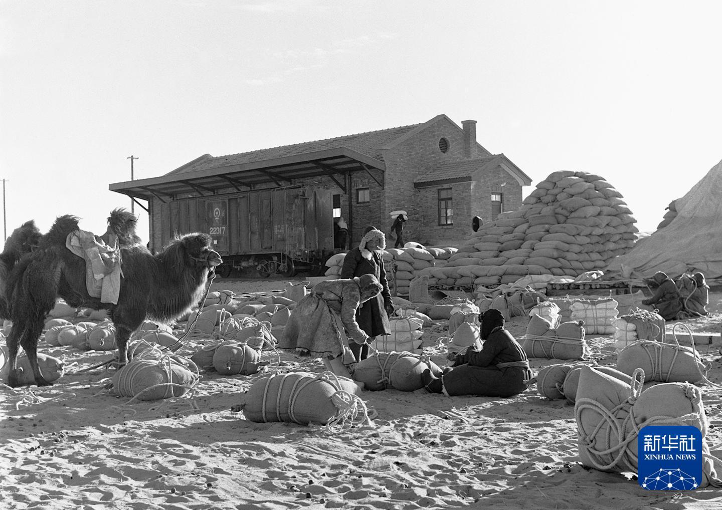 1955年拍摄的堆集在集二铁路二连车站上的粮食。集二铁路的通车给内蒙古农牧民带来了大量粮食和生活用品。