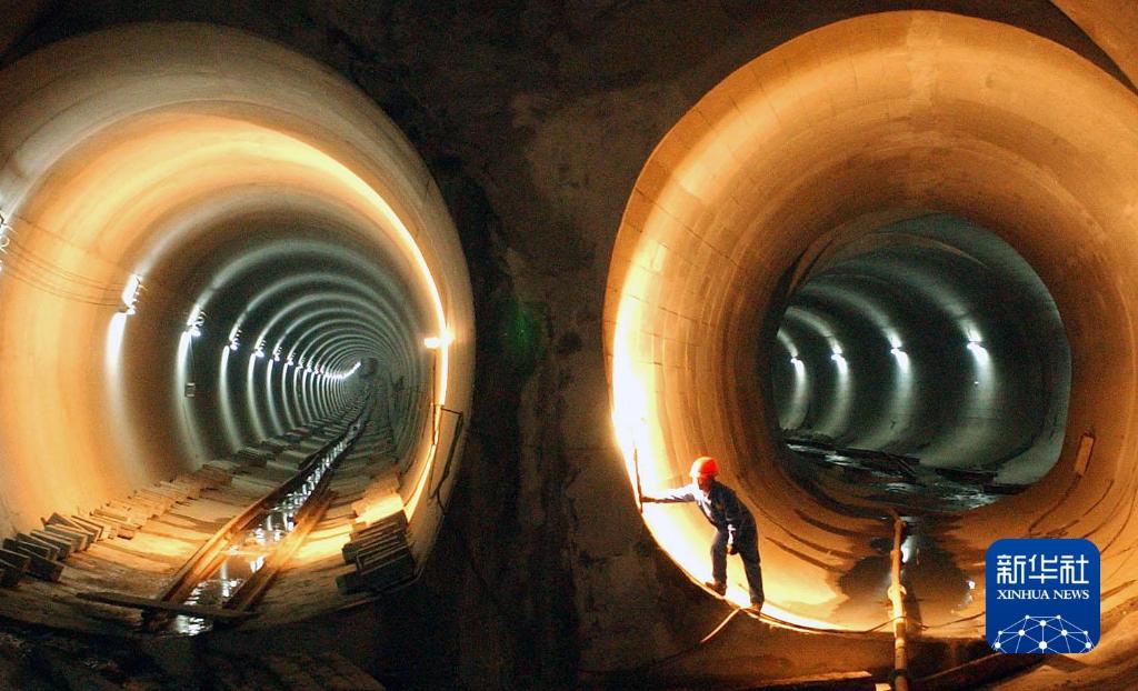2003年12月10日,南京地铁一号线一期工程实现全线贯通,一名工人在南京站隧道内调整照明灯光。