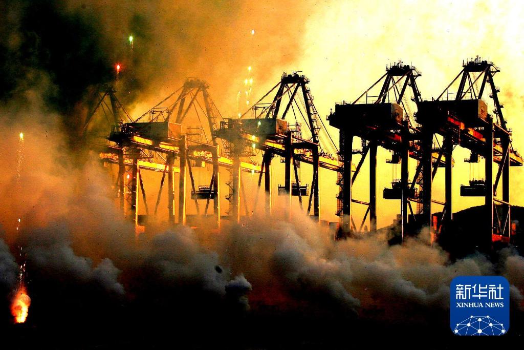 2008年12月6日,在上海洋山深水港三期工程建成仪式上,烟花在北港区码头上燃放。