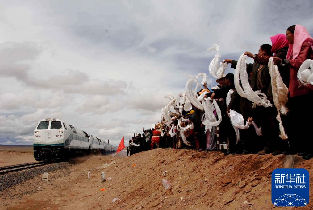 2006年7月1日,青藏铁路全线通车。在青海沱沱河大桥桥头,当地群众欢迎从格尔木出发的“青1”次列车。