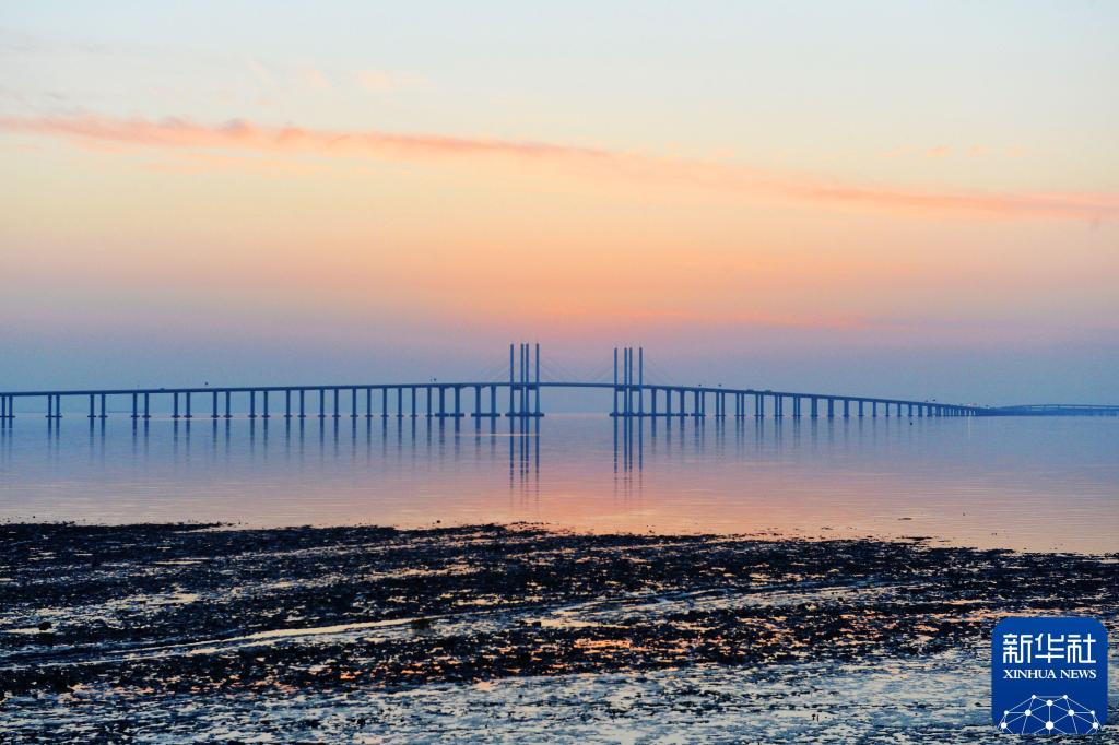 2017年12月25日,晚霞映衬下的山东青岛胶州湾跨海大桥“长虹卧波”,美如画卷。