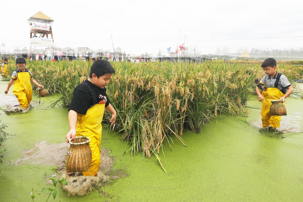 10月3日,孩子们在浙江省义乌市赤岸镇一处稻鱼共生的稻田里捉鱼。新华社发(龚献明摄)