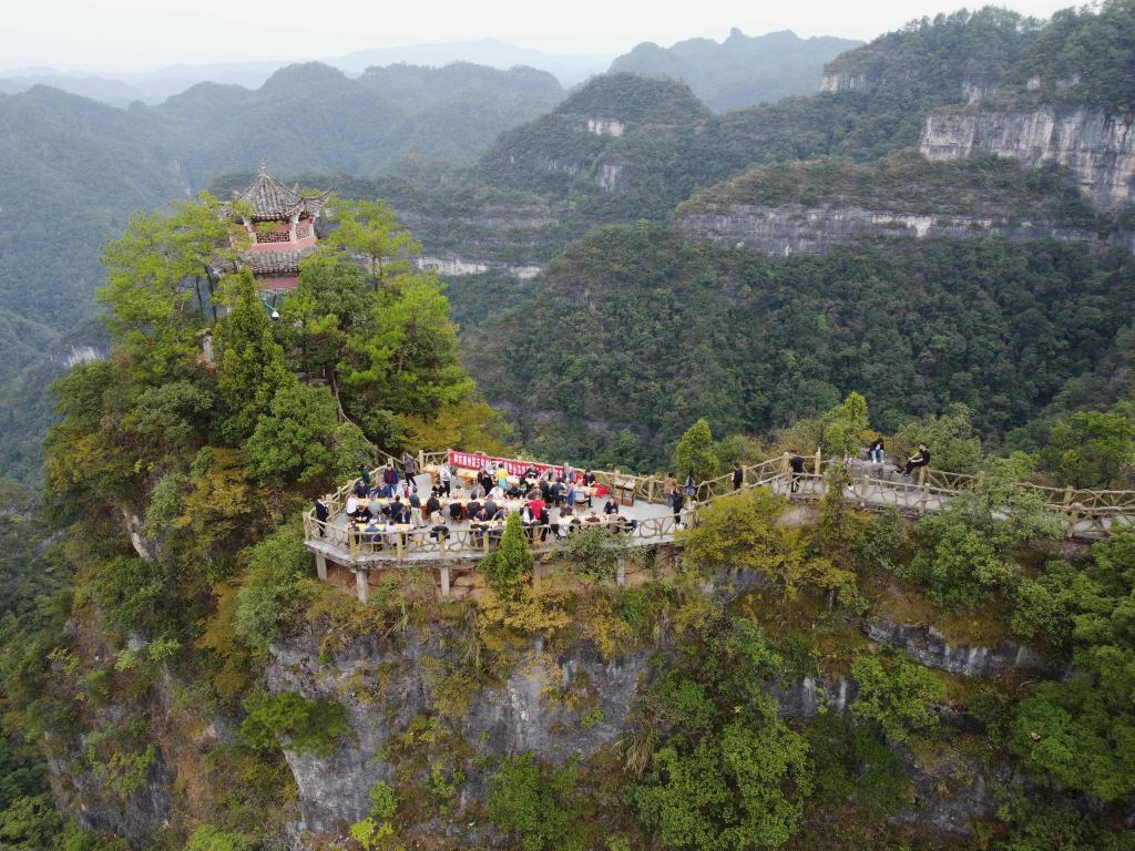 10月5日,在贵州省黔东南苗族侗族自治州施秉县云台山,围棋爱好者在参加比赛(无人机照片)。新华社发(邰胜智摄)
