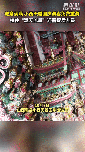 10月7日,山西隰县小西天景区拿出诚意:自即日起至年底,凡今年中秋、国庆假期来小西天游览过的朋友,可凭借购票凭证,免门票再次进入景区参观游览。网友们纷纷评论:真是诚意满满!这个国庆假期,来自全国各地“天命人”纷纷踏上小西天“取经”之路,9万人的隰县,在国庆假期却接待了超9万的超大客流。