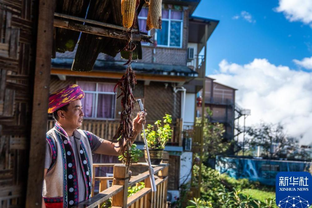2020年11月3日,在云南省怒江州福贡县匹河怒族乡老姆登村,村民在自家开的客栈直播怒江大峡谷美景。