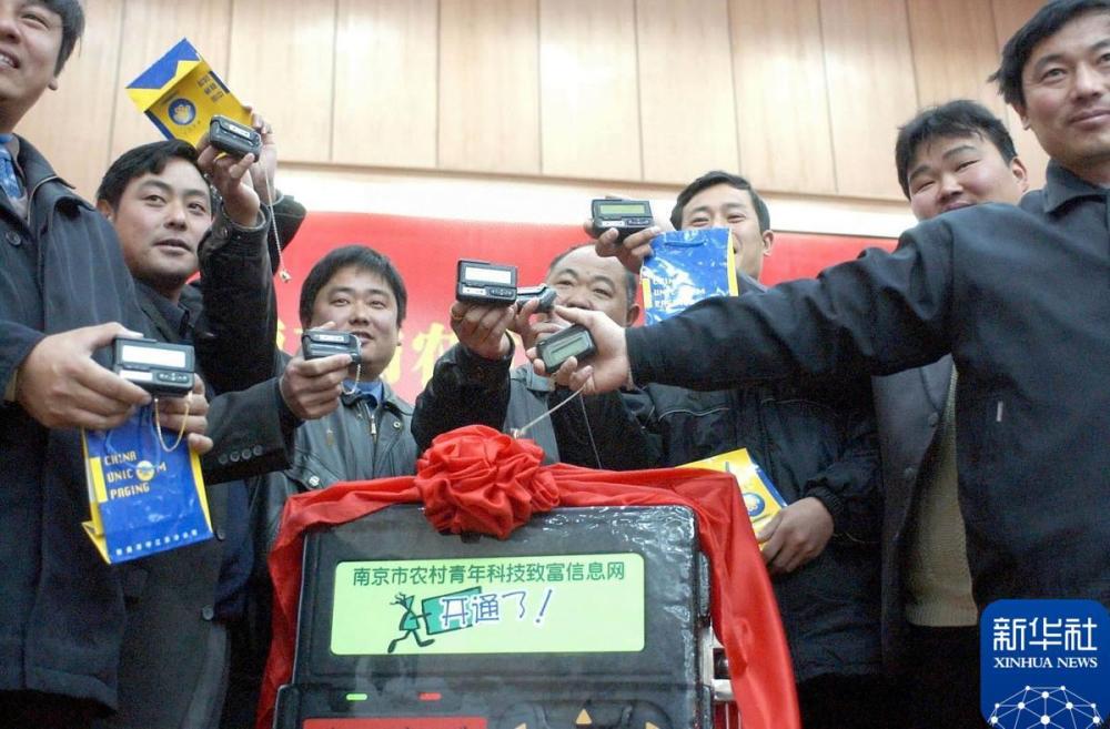 2002年12月15日,江苏溧水永阳镇的农民在展示他们的中文寻呼机。