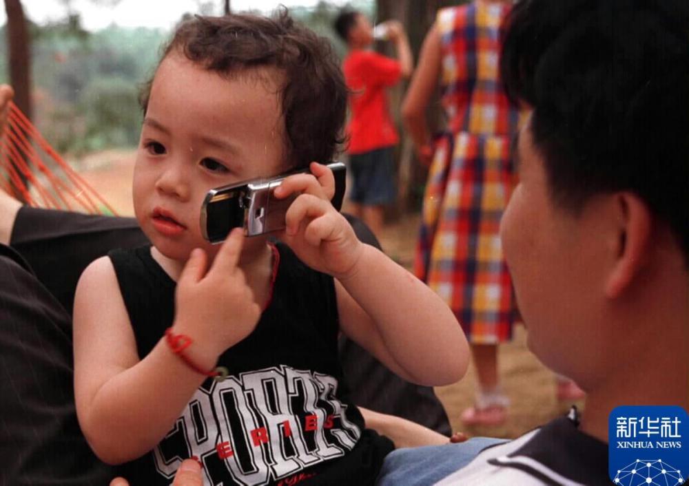 2000年,广西南宁古城路的一名小朋友正在南宁石门公园用手机问候香港的亲戚。