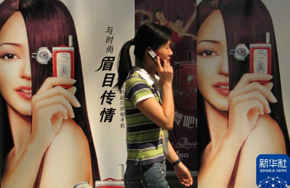 2004年5月19日,一名正在打手机的女青年从新款手机广告前走过。