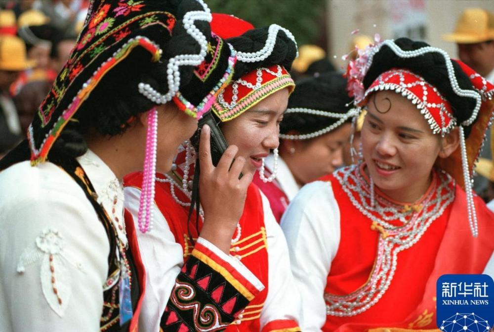 1996年,在云南宁蒗,一名女青年用手机与亲友通话。