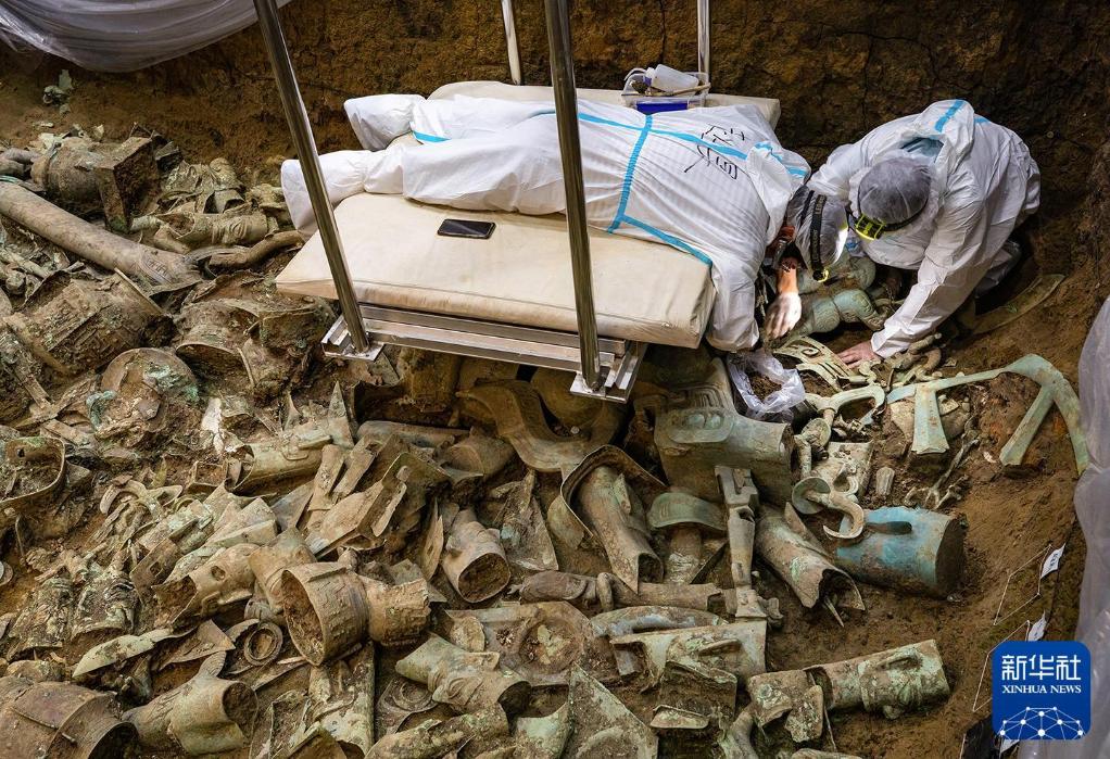 2022年6月1日,考古工作者在位于四川广汉的三星堆遗址8号“祭祀坑”清理铜神坛。新华社记者 沈伯韩 摄