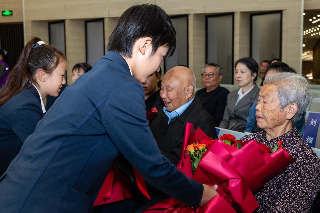 学生代表向南京大屠杀幸存者艾义英、刘民生献花。(侵华日军南京大屠杀遇难同胞纪念馆供图)