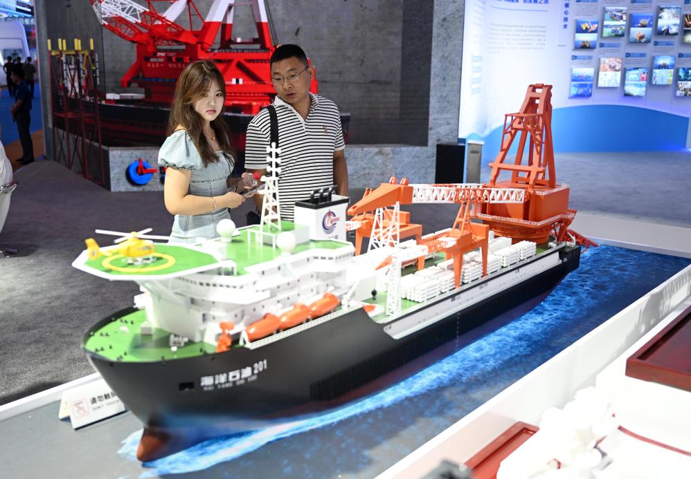 7月12日,与会者在航运展上参观“海洋石油201”船舶模型。新华社记者 赵子硕 摄
