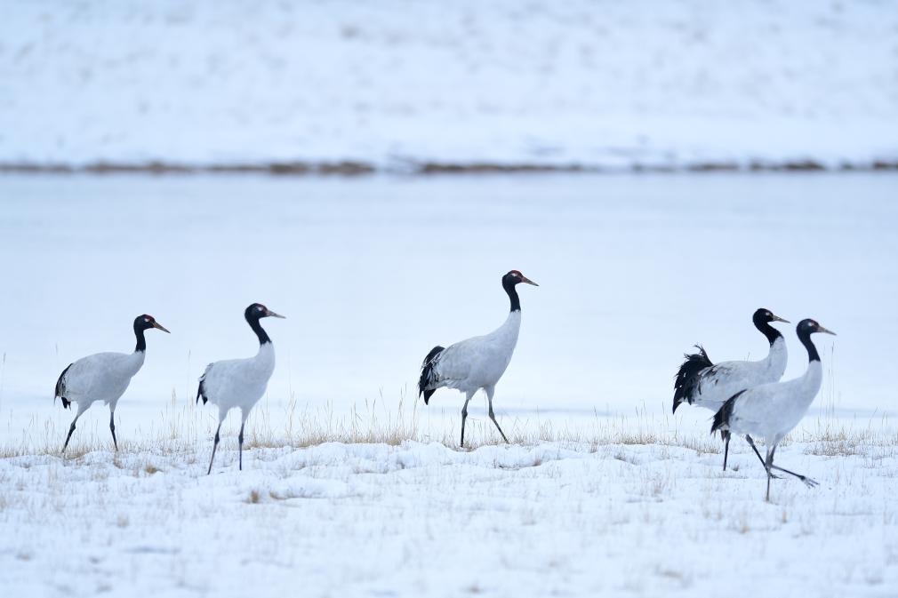 在三江源国家公园黄河源园区漫步的黑颈鹤。新华社记者 张龙 摄