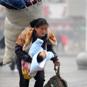 2010年1月30日,巴木玉布木背着大包、抱着孩子在南昌火车站匆忙赶车。新华社记者 周科 摄
