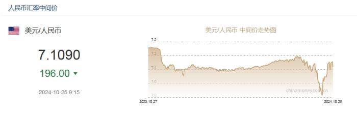 据中国外汇交易中心网站消息,中国人民银行授权中国外汇交易中心公布,2024年10月25日银行间外汇市场人民币汇率中间价为:1美元对人民币7.1090元,上调196个基点。