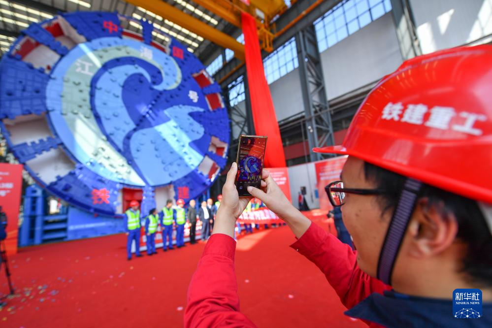 10月31日,在铁建重工长沙第二产业园,工人在下线仪式上拍摄超大直径盾构机“江海号”。新华社记者 陈泽国 摄