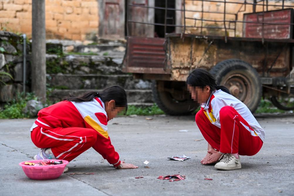 在广西靖西市一个村子里,两名小学生下午放学后玩“烟卡”(10月16日摄)。