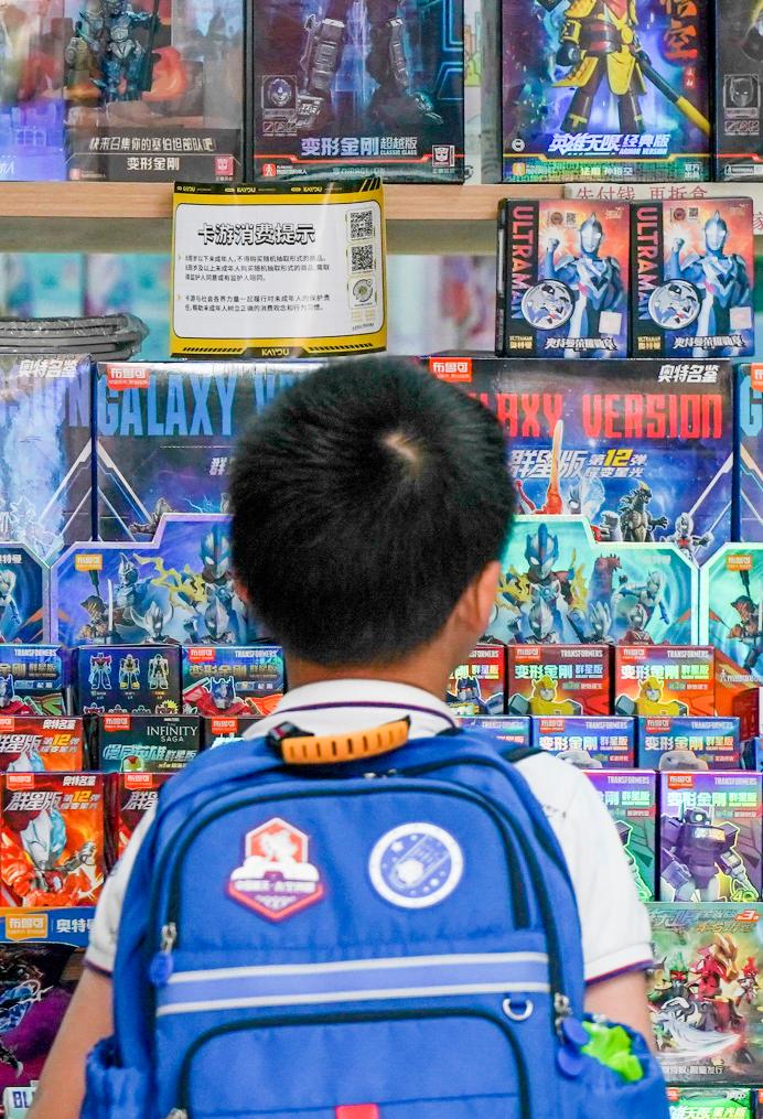 在江苏南京市一小学附近的文具店,一名小学生选购卡牌盲盒(10月14日摄)。虽然柜台前贴出的卡游消费提示明确写道,8岁以下未成年人不得购买卡牌盲盒,8岁及以上未成年人购买卡牌盲盒需取得监护人同意或有监护人陪同,但据记者观察,商家在实际销售时“给钱就卖”。