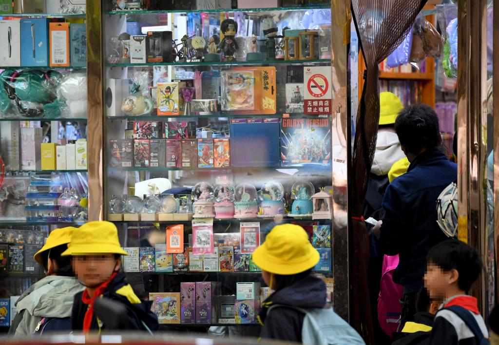 在河南省郑州市金水区一小学附近的书店,显眼位置摆放着售卖的卡牌盲盒(10月24日摄)。