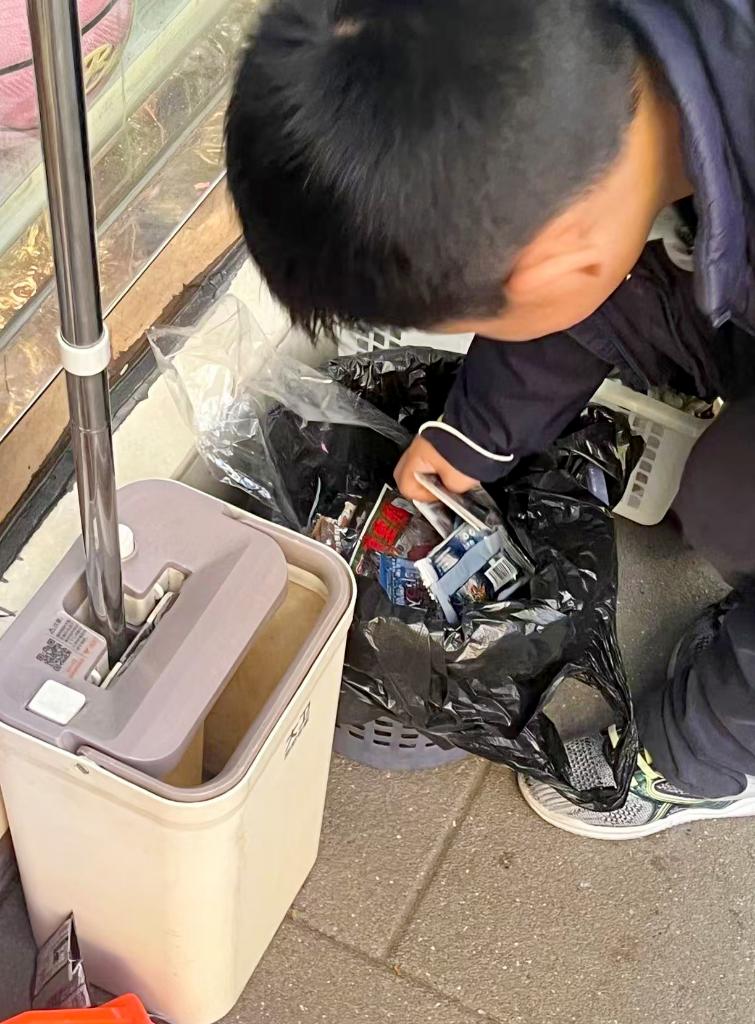 在河南省郑州市金水区一小学附近,一名小学生在垃圾桶内翻找同学们丢弃的卡牌(10月24日摄)。