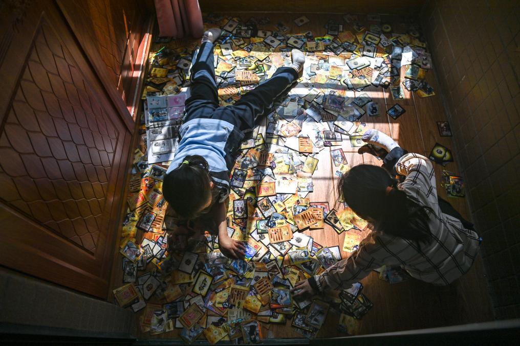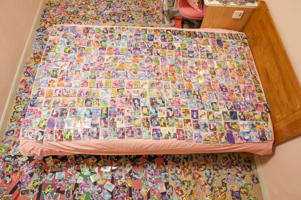 在广州一位市民家中,孩子购买的卡牌铺满卧室(10月24日摄)。这位市民表示,孩子一度痴迷卡牌盲盒,并花费大量时间和金钱,令家长十分忧心。
