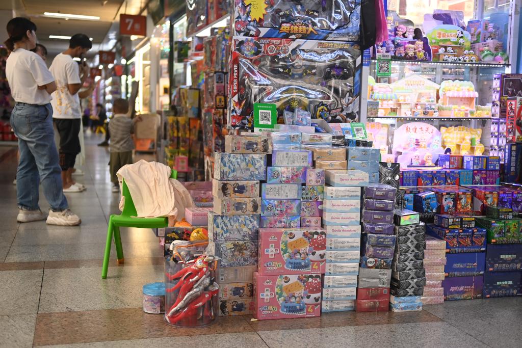 在素有“世界超市”之称的浙江义乌国际商贸城一家玩具饰品店门前堆放着各类卡牌盲盒等玩具(10月17日摄)。