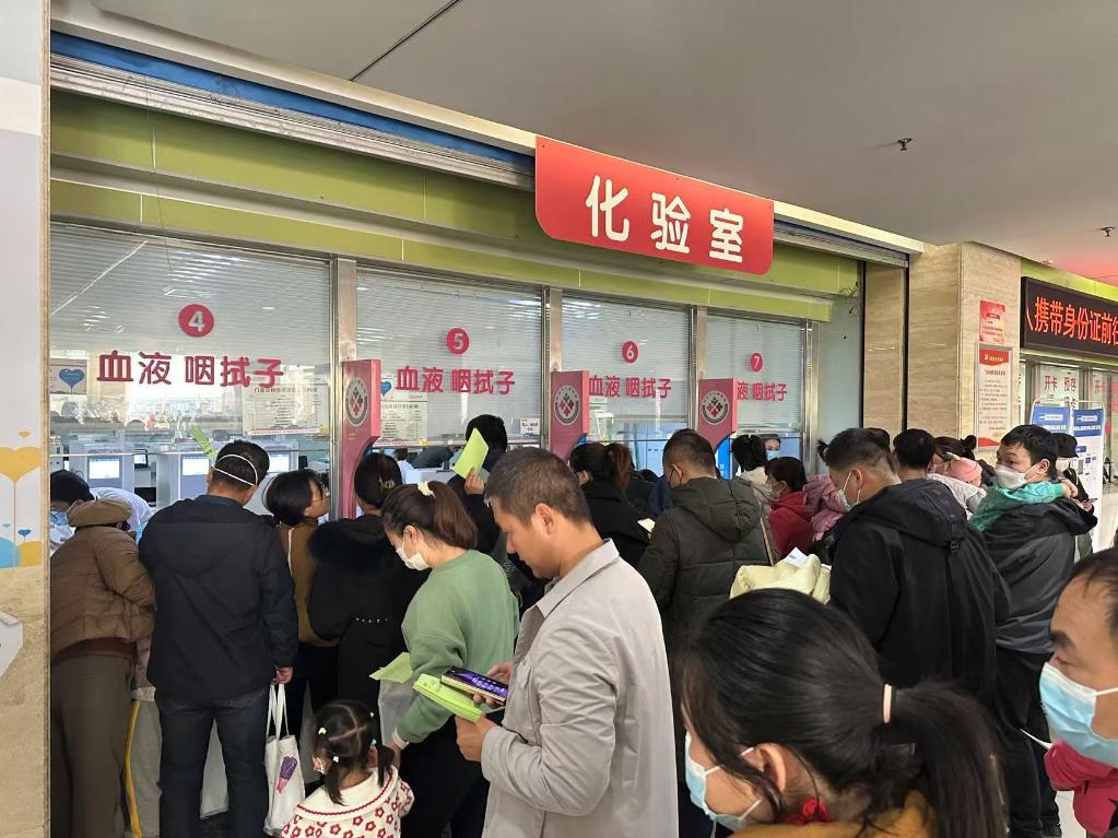 2023年12月6日,在西安市儿童医院,患儿和家属排队化验(资料照片)。新华社记者 蔺娟 摄