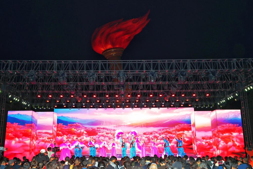 夜幕降临,井冈山南山火炬广场,文艺工作者携手各族群众同声高唱《走向复兴》……
