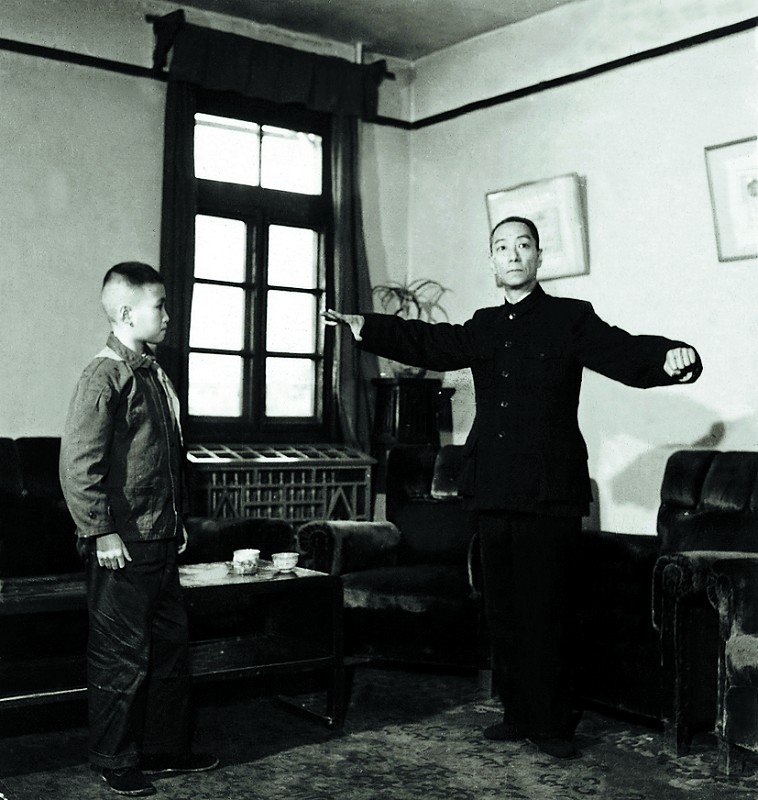 谭富英(右)为孙子谭孝曾说戏。(北京京剧院供图)