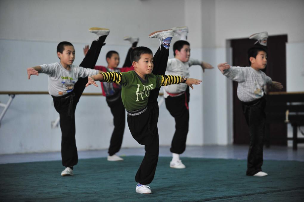 2011年11月3日,学生在沈阳师范大学附属艺术学校京剧专业的练功房里练习基本功。(新华社发,田卫涛摄)