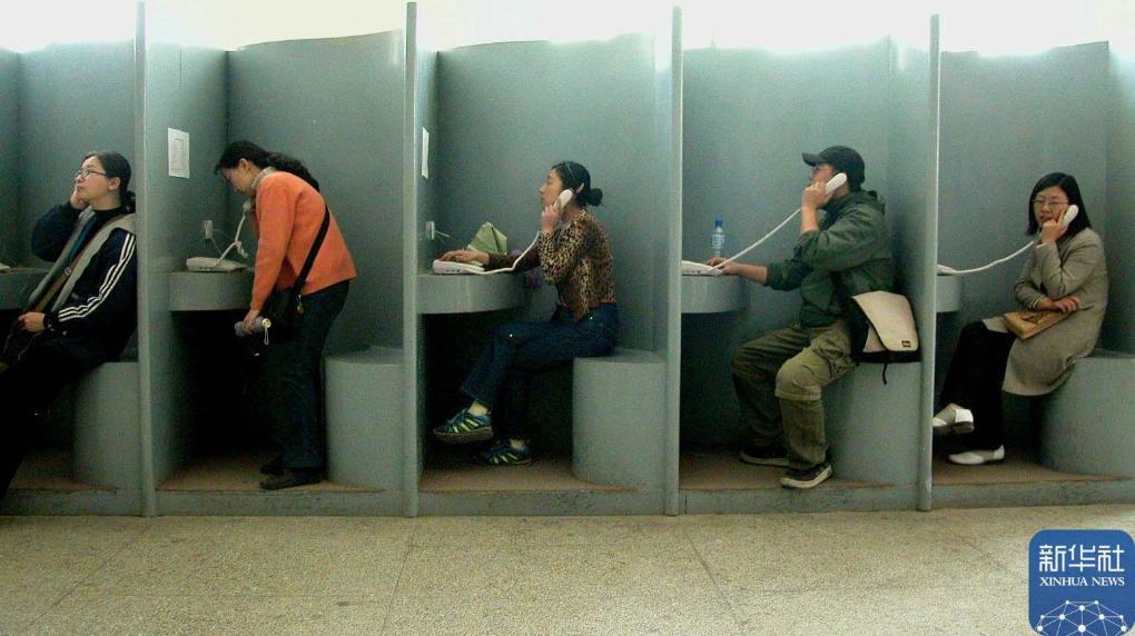 2002年4月23日,陕西延安的几位市民在公用电话间内拨打长途电话。