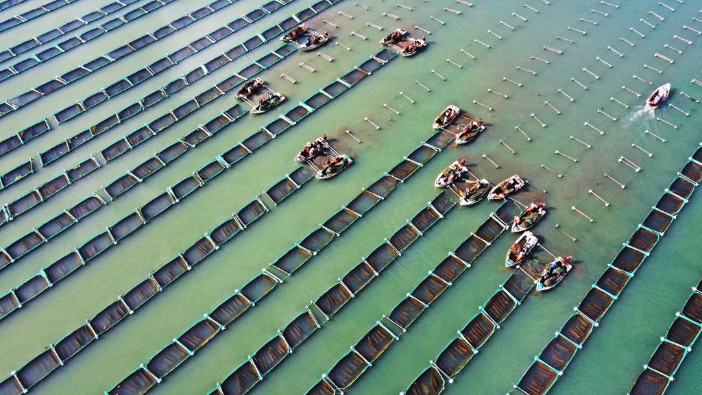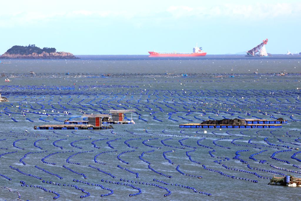 近日,“海上粮仓”养殖工人忙于海上作业,供应市场需求,一派繁忙景象。