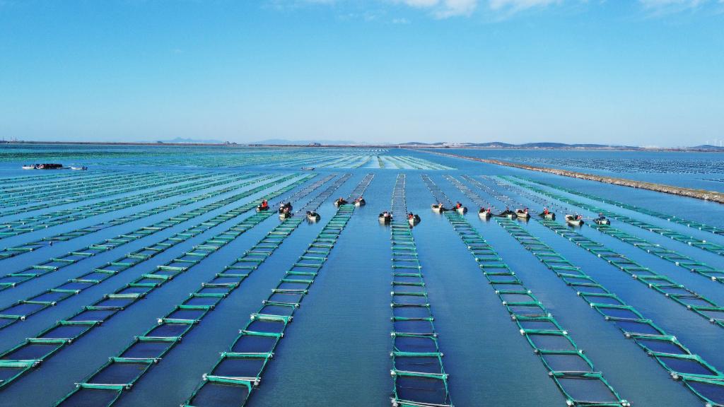 ↑2024年11月5日,在山东省荣成市虎山镇天海湾海洋牧场海参育苗区,养殖工人们忙着进行海参苗收获作业(无人机照片)。CICPHOTO/王福东 摄