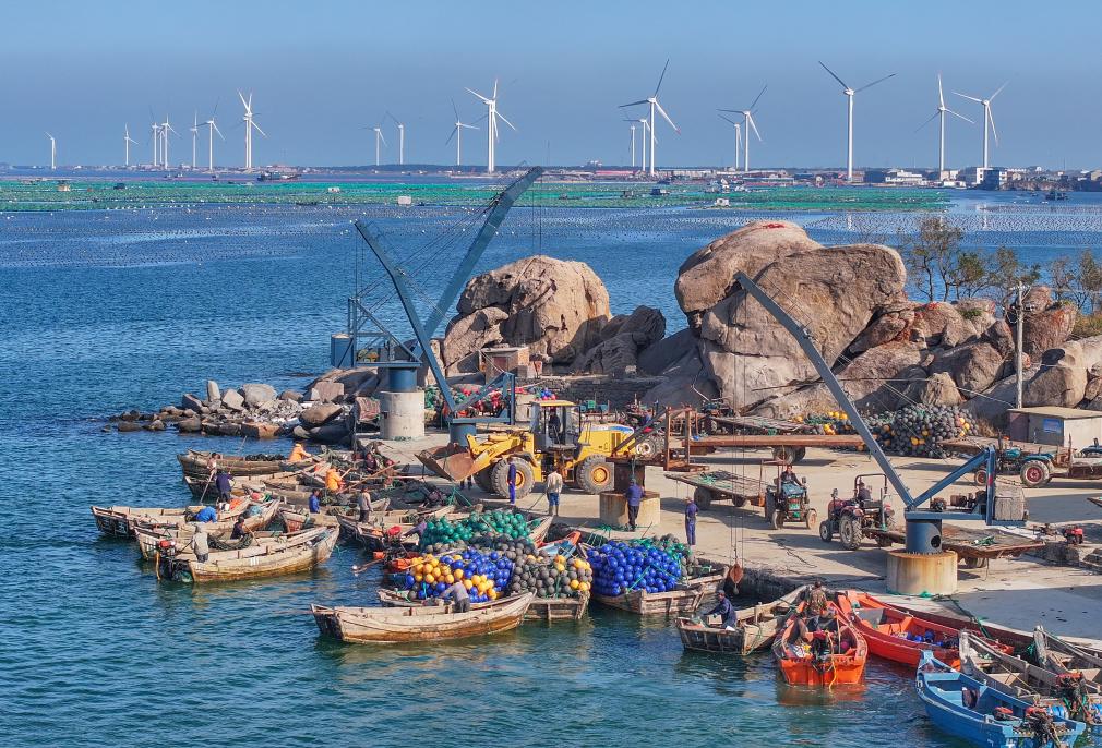 ↑2024年10月31日,在山东省荣成市石岛管理区桑沟湾海洋牧场一处码头,渔民驾驶渔船准备出海作业。(无人机照片)CICPHOTO/李信君 摄