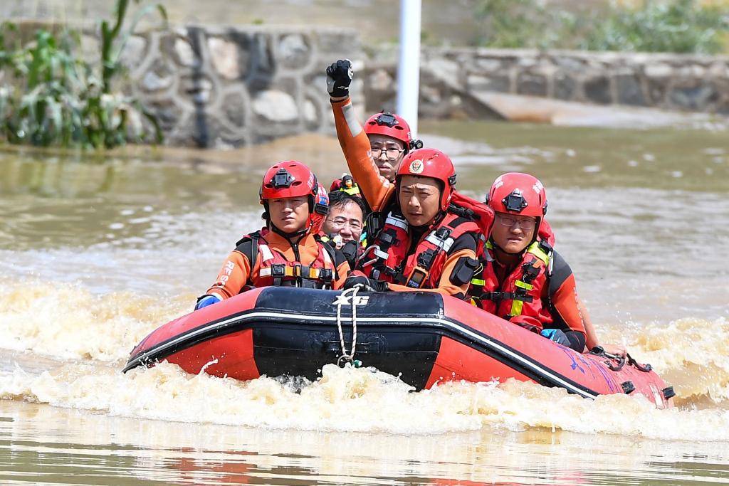 2024年7月29日,记者张楠(左二)跟随消防救援人员乘坐橡皮艇,为吉林省临江市解放社区受灾群众运送物资。