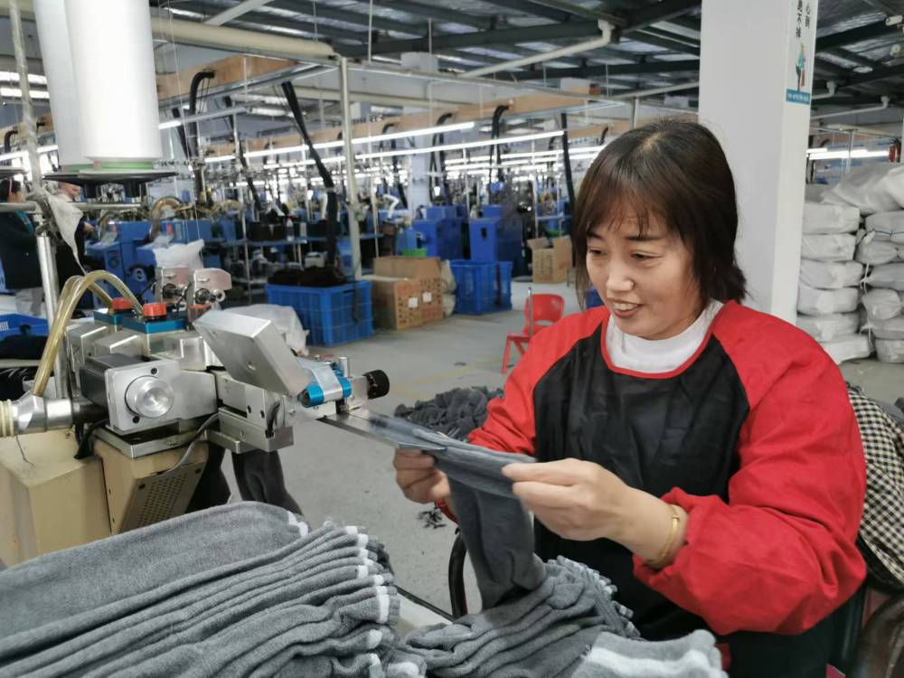 2021年11月,江苏省泗洪县一家针织厂里,留守妇女正在熟练地缝制产品。新华社记者段羡菊摄