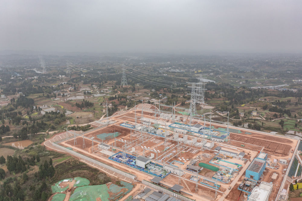 2024年3月17日在重庆市铜梁区拍摄的重庆铜梁1000千伏变电站施工现场(无人机照片),该变电站是川渝特高压入渝的首个落点变电站。川渝1000千伏特高压交流工程是国家“十四五”电力发展规划重点输电工程,建成后预计每年可输送电量350亿千瓦时,能有效推动川西甘孜、阿坝地区水电等清洁能源外送,保障成渝负荷中心用电需求,助力成渝双城经济圈、长江经济带高质量建设。