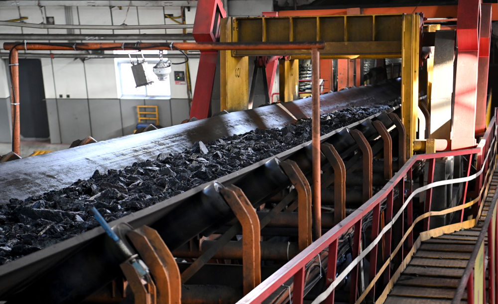 2024年2月29日,陕西陕煤曹家滩矿业有限公司的输送带将煤炭从主井口运出。多年来,榆林市着力发展煤炭分质利用、煤基高端化工、氯碱化工等6条产业链,积极打造“煤头化尾”全产业链化工产业基地。