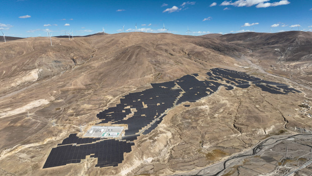 2024年10月17日在西藏日喀则市萨迦县拍摄的中核萨迦300兆瓦风光储一体化电站(无人机照片)。2015年实现“藏电外送”以来,西藏清洁能源已外送至华东、华中、华北、西北、西南等地区。截至2024年8月30日,清洁能源外送累计达146亿千瓦时,助力受电省份减少标煤使用约448万吨,减排二氧化碳约1117万吨、二氧化硫约34万吨。