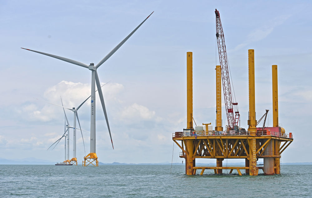 2024年5月21日拍摄的广西防城港海上风电示范项目A场址。该项目是广西首个海上风电示范项目,全部建成投产后,将通过能源通道输送超50亿千瓦时清洁能源,可满足近500万户家庭的基本用电。