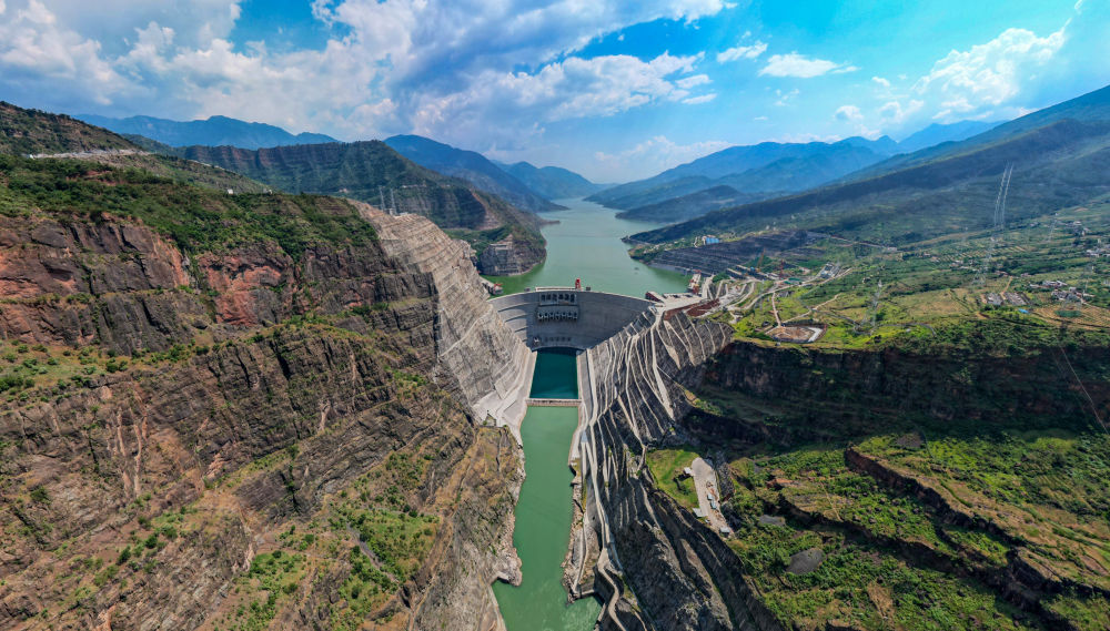 2024年8月28日拍摄的白鹤滩水电站(无人机全景照片)。白鹤滩水电站是世界第二大水电站,位于云南省巧家县和四川省宁南县交界处金沙江干流,是我国实施“西电东送”的国家重大工程。截至2024年3月底,白鹤滩水电站累计发电超1200亿千瓦时,为江苏、浙江等华东地区提供源源不断的清洁电能。