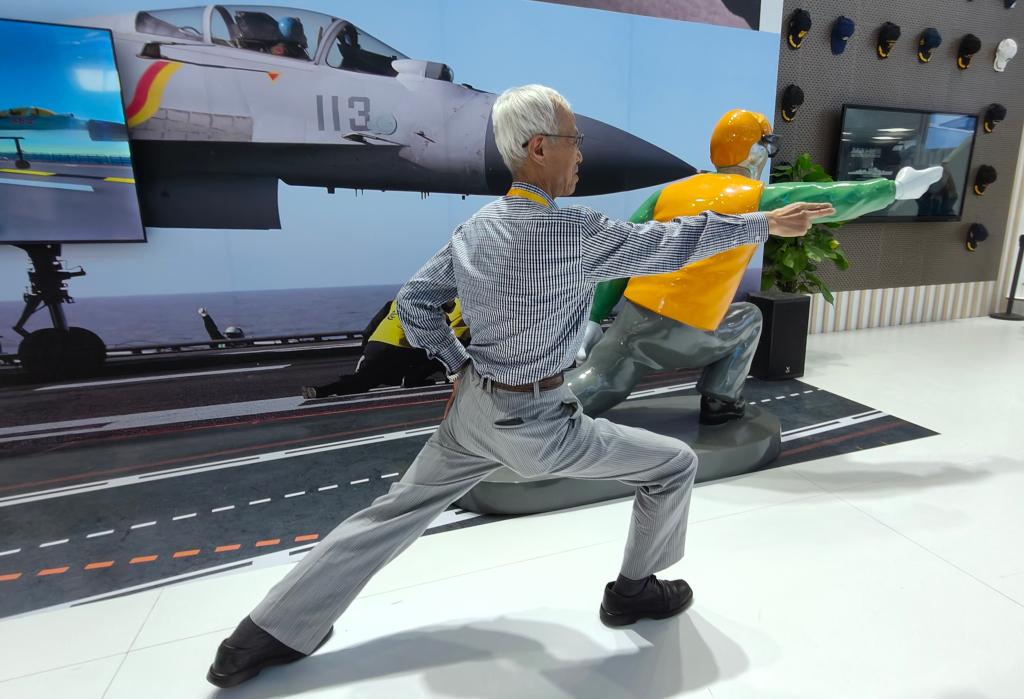 11月12日,一位老人在第十五届中国航展的人民海军展厅体验“航母style”。新华社记者 黎云 摄