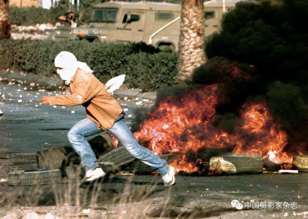 1998年,在约旦河西岸城市拉姆安拉,巴勒斯坦青年与以色列士兵发生了激烈冲突。上百名巴勒斯坦青年示威者,躲在马路两旁的房屋后面,向30多米外的以色列士兵投掷石块和燃烧瓶。以色列士兵则在马路中间,以几辆军用吉普车作为屏障向示威者射击。我端起相机,低下身子,一步一步往前凑。一个用围巾蒙住小半边脸的巴勒斯坦小伙子弓着腰跑到马路中间,点燃轮胎,设置路障,然后匆忙逃离,远处一位以军士兵正在举枪向他瞄准。我按下了快门,这时我们正好成三点一线的位置。耳边不时响着橡皮子弹的嗖嗖声,一颗子弹落到我脚边不远处的地方,满地打滚。