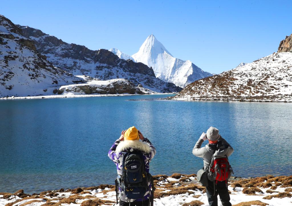 初冬时节,四川省甘孜藏族自治州稻城亚丁景区的“牛奶海”呈现出清澈的蓝色,湖水四周被洁白的雪山和冰川环绕,宁静而壮美,吸引各地游客前来打卡拍照。