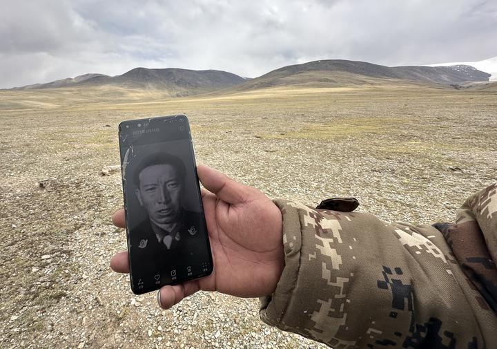 2024年6月15日,在西藏那曲市尼玛县境内的羌塘国家级自然保护区“无人区”深处,格桑伦珠向记者展示他手机中珍藏的罗布玉杰的照片。新华社记者费茂华摄