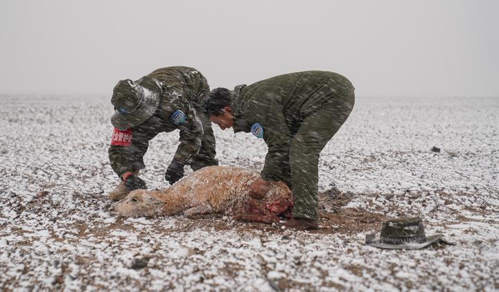 由于母羊倒下的位置距离营地太近,野狼不敢上前享用自己的猎物,只能悻悻而去。野管队员们看到风雪中挣扎的母羊,心中不忍,将母羊抬到帐篷中进行救助。但由于伤势太重,母羊肚皮被咬开且内脏严重受损,野保队员只能将它的肚皮缝上之后,按照惯例放归到羌塘大草原。
