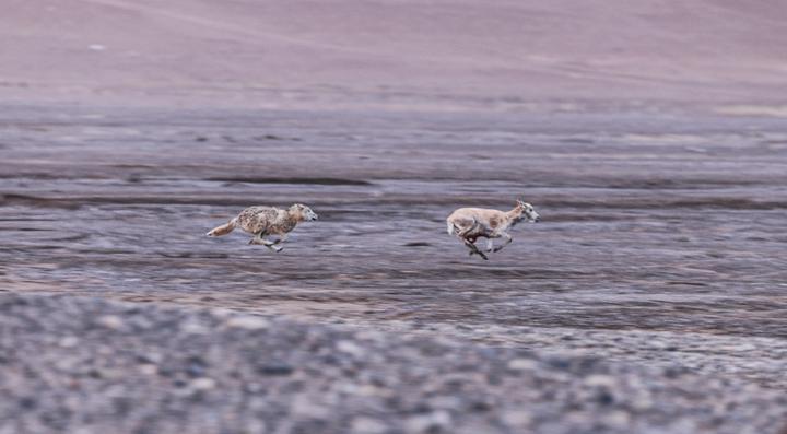 2024年6月14日,在西藏那曲市尼玛县境内的羌塘国家级自然保护区“无人区”深处,一只野狼在追逐一只怀孕的母藏羚羊(视频截图)。新华社发(达瓦多吉摄)