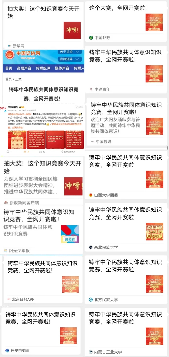 新华网首页推广,中国记协在官网刊登大赛启动新闻,中国青年报、中国妇女报、中国民族报、北京日报、阳光少年报、光明网、新浪网等主流媒体平台加入传播行列,中国邮政、中国电科、中国建筑、中国中车、中国铁塔等中央企业转发互动,山西大学、西北民族大学、北方民族大学、内蒙古工业大学等高校积极响应。包括UU跑腿的“跑男”和申通的“快递小哥”等都积极参与到了竞赛答题中来。